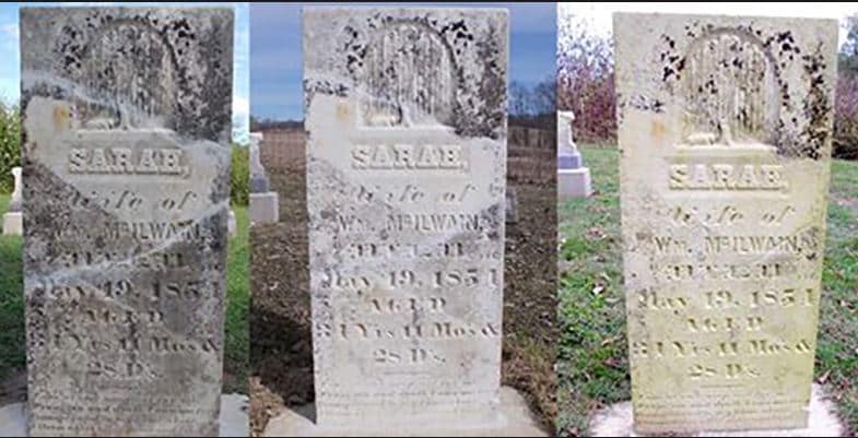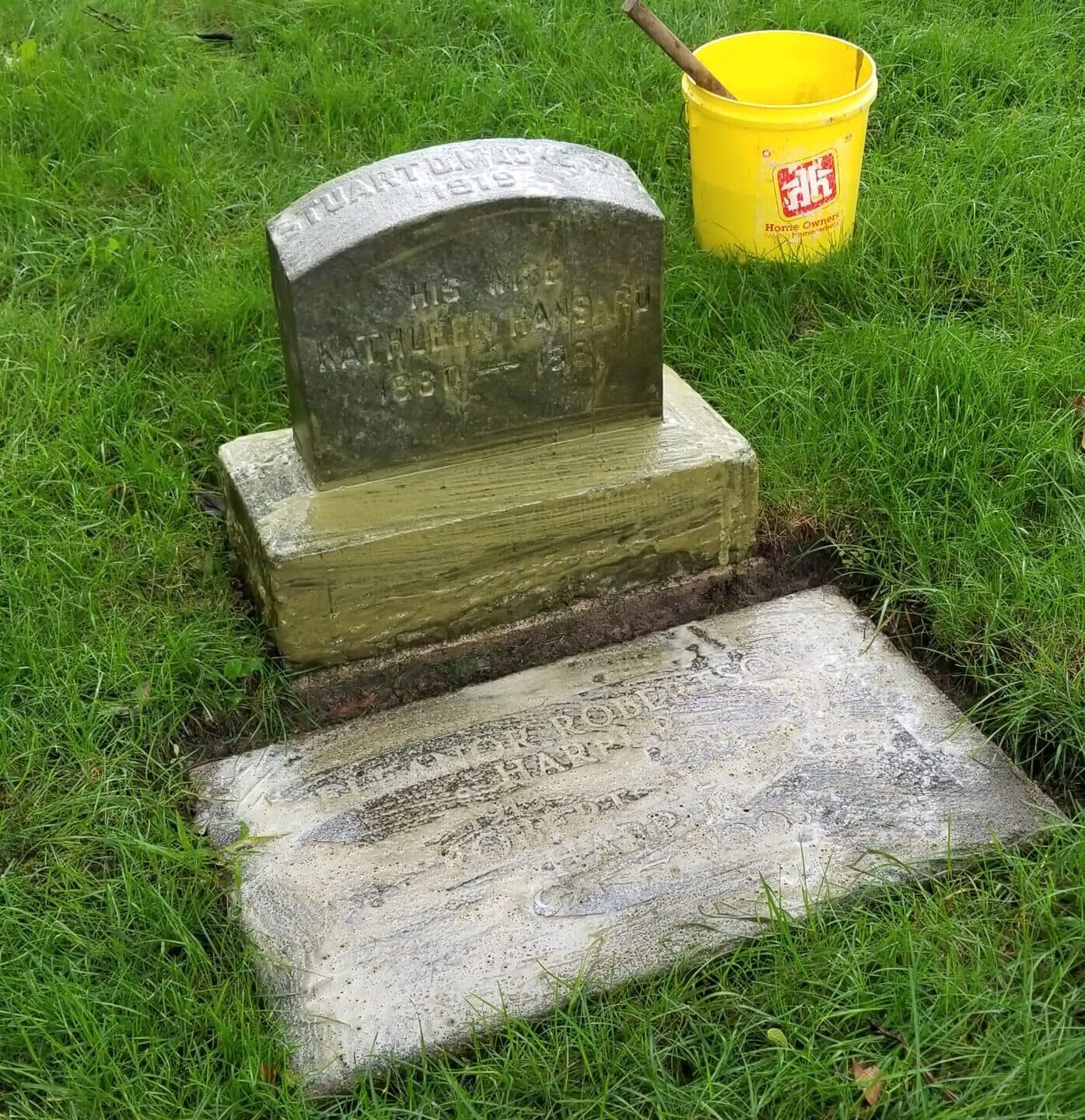 Staining and soiling of gravestones, historical monuments, markers, and statuary can result from many different causes. It can include soil splashing, pollution, rusting bolts and other metal features, bird deposits, berries, and sap dropping. Biological growth, such as algae, moss, or lichen, can cover an entire monument or simply part of it. These issues cause a monument to decay, make reading difficult, and lead to and cause long-term failure. Cleaning should be done with the gentlest means possible using the right products for the type of soiling. We use proper techniques with a cause-no-harm approach to everything we do.